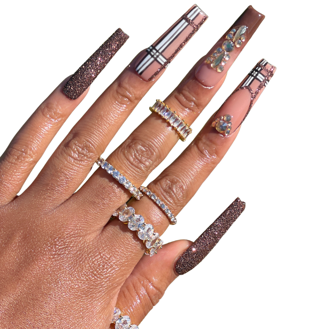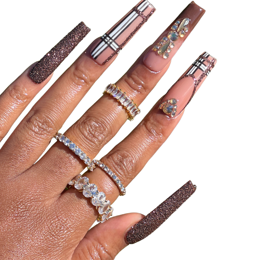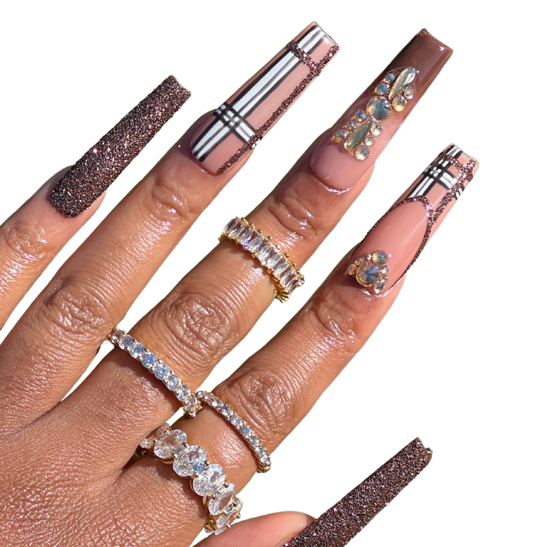 Going home for the holidays? This set is perfect for the fall/winter season, it features gold bling accents and deep chocolate sugar glitter.