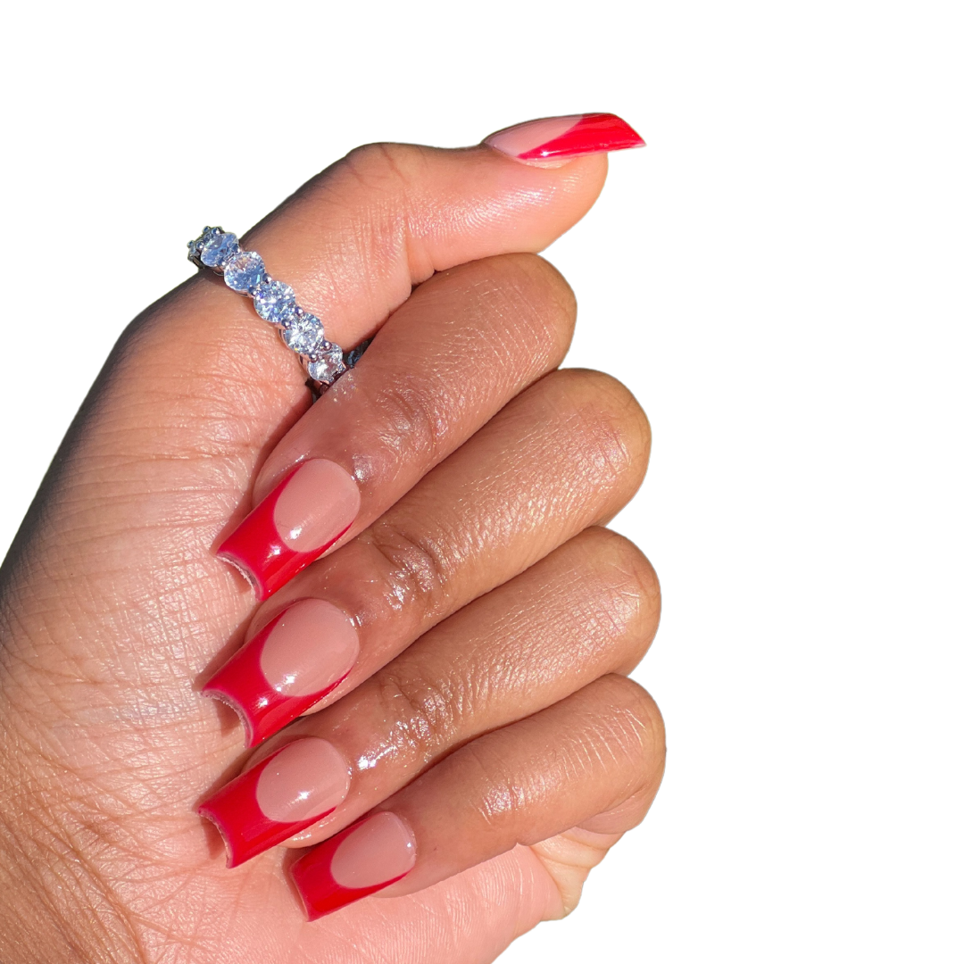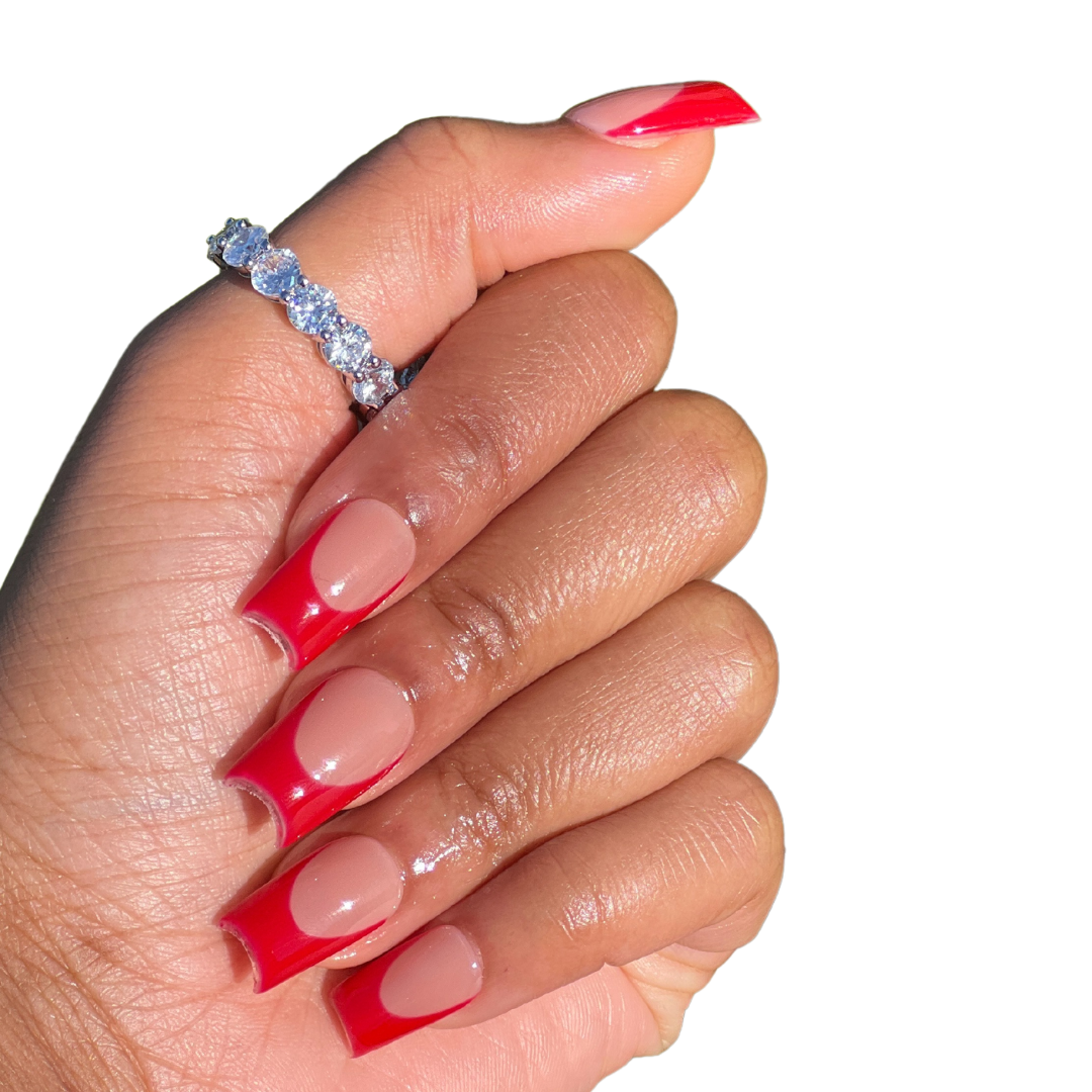 Perfect red french-tips on a deep nude base.