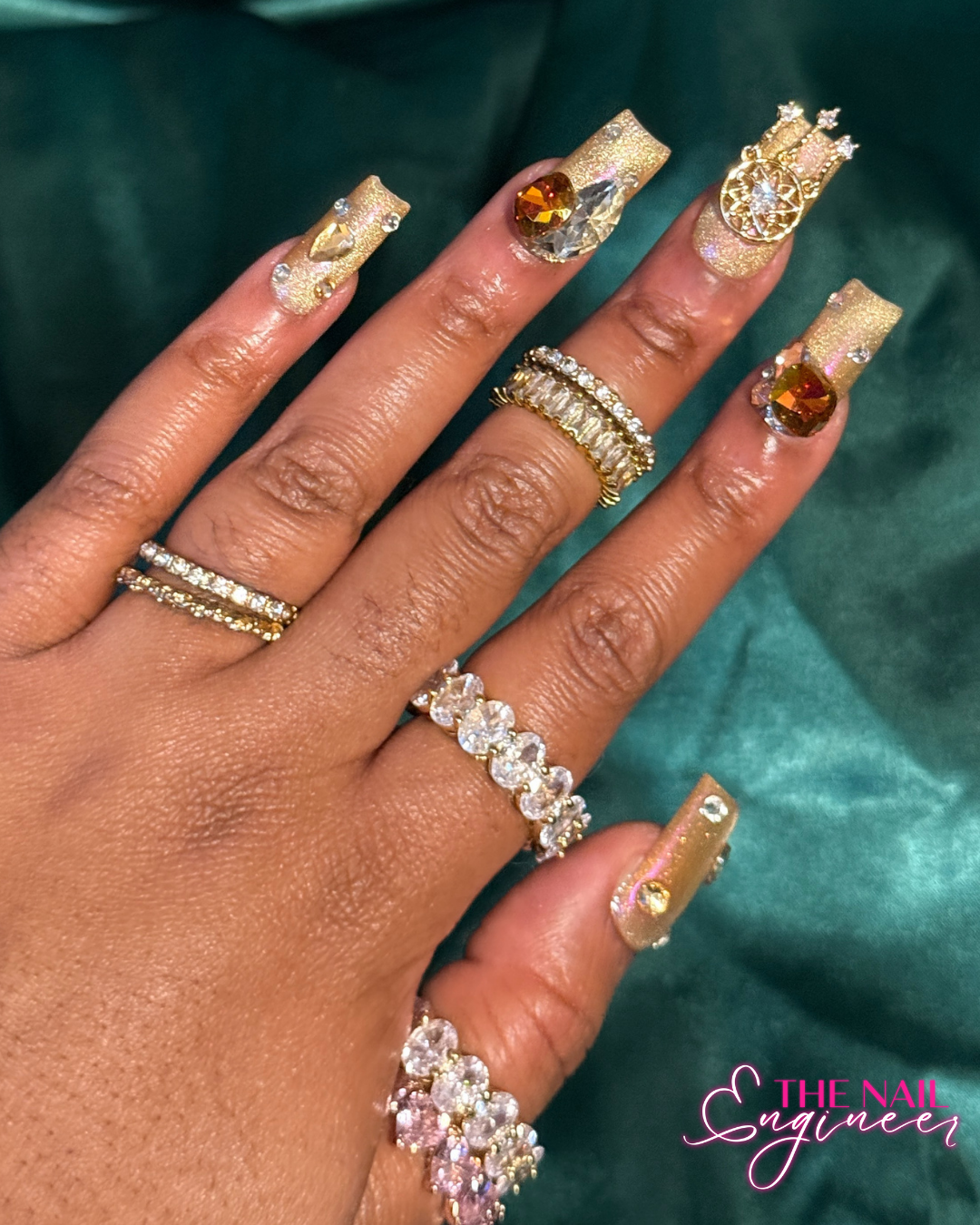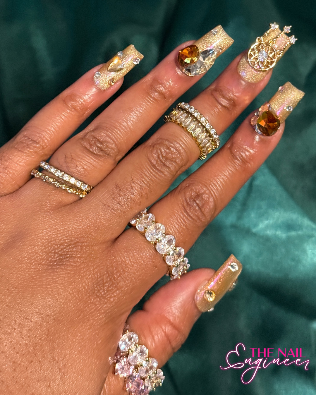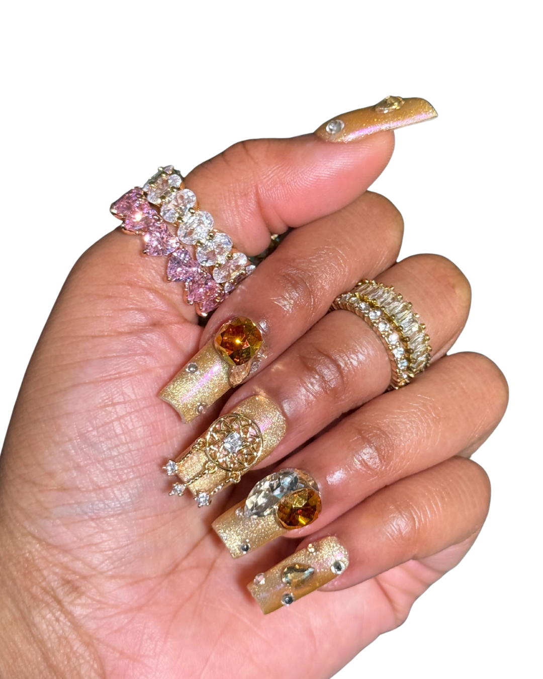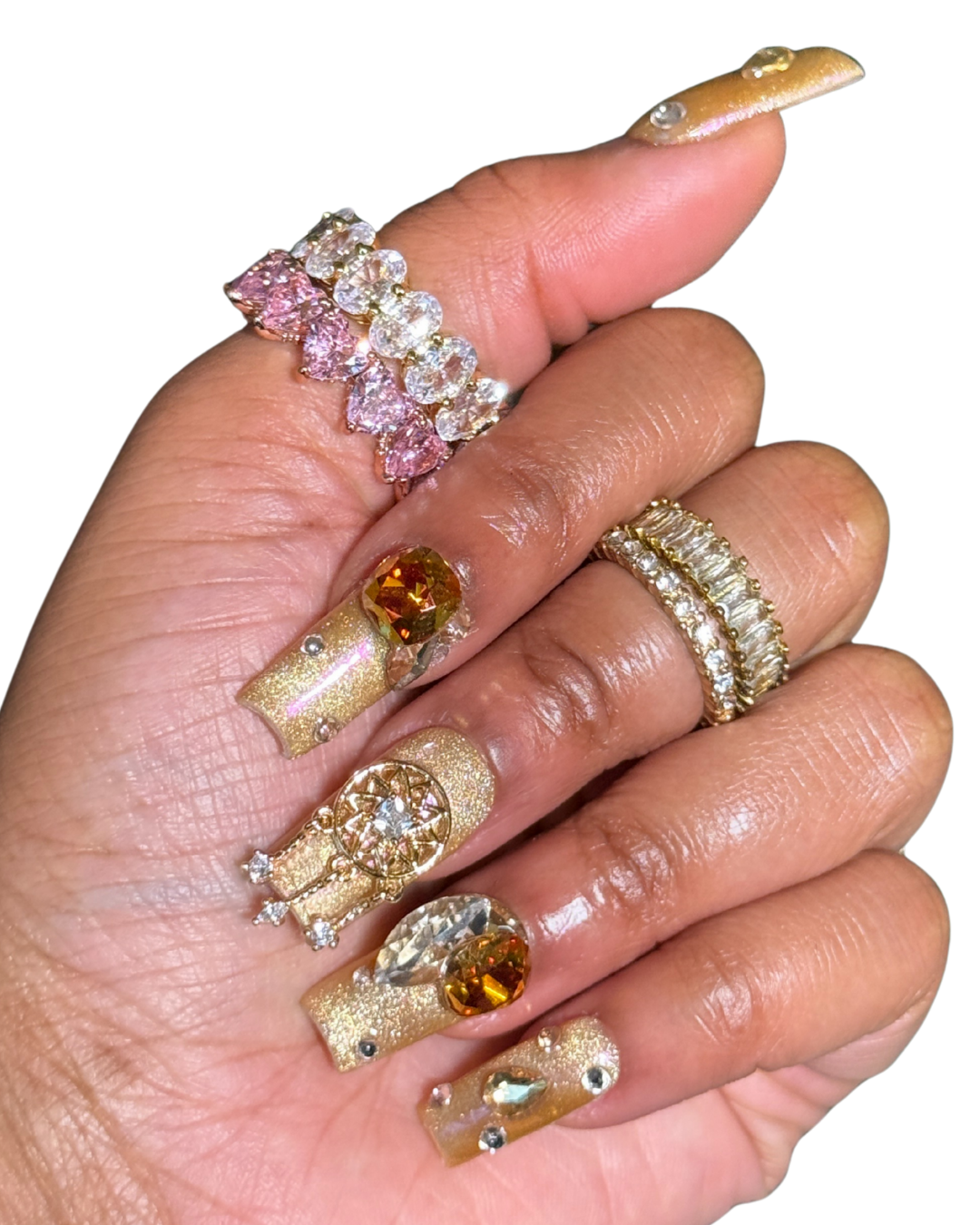 - 10 golden pink cat eye chrome nails with bling designs (featuring 2 dream catcher charms)