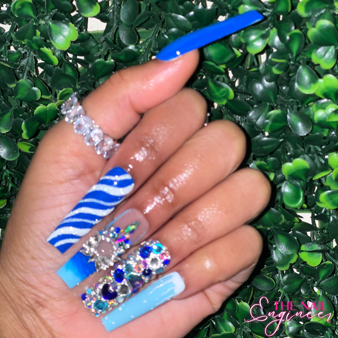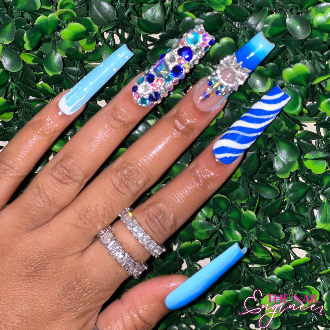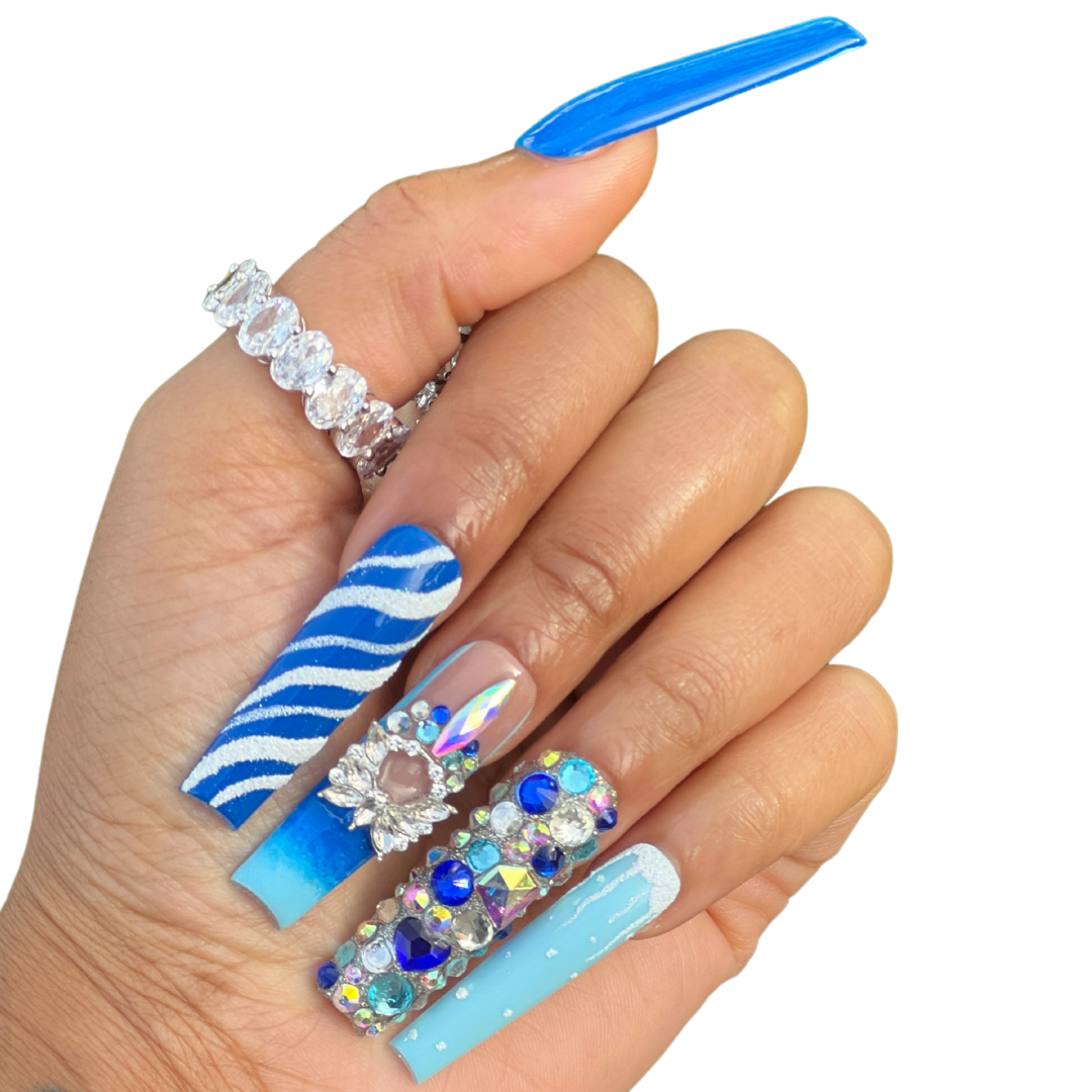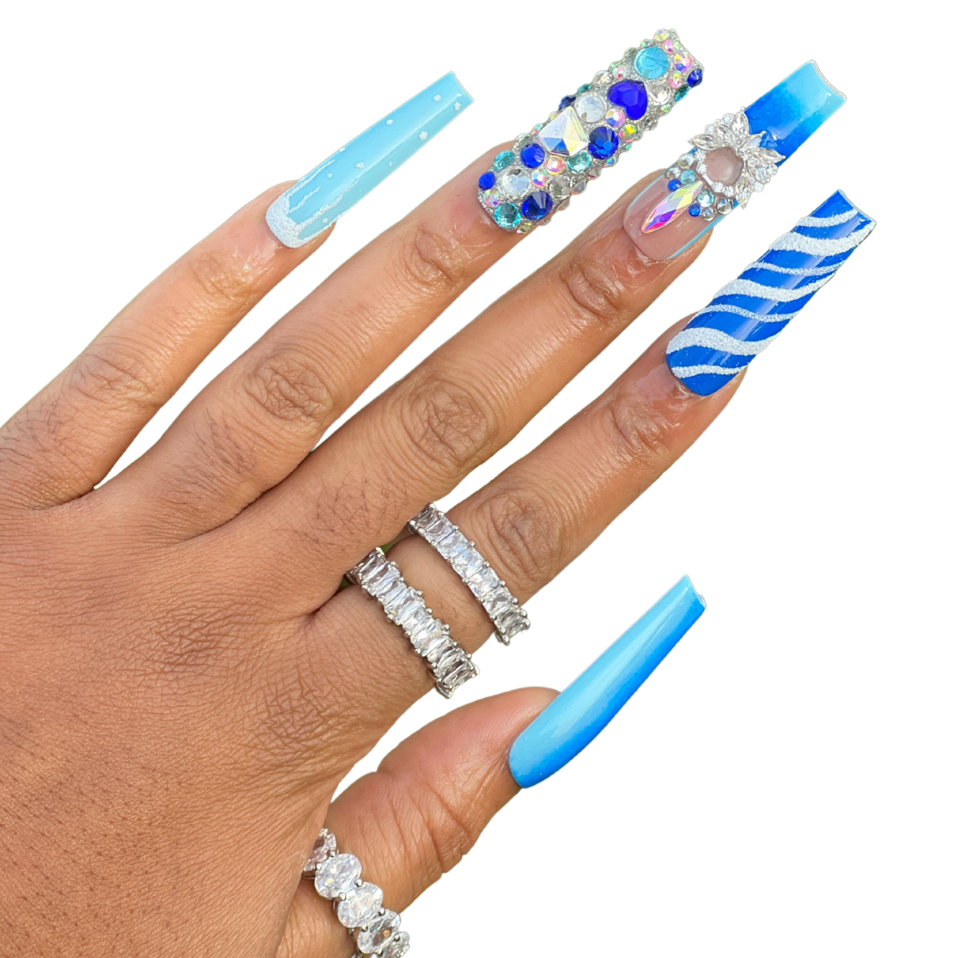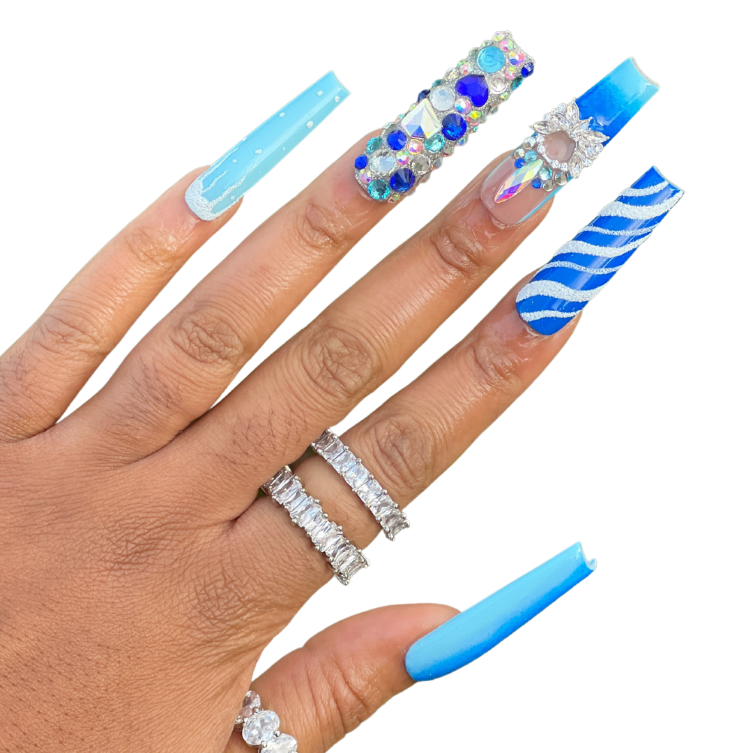 So Frosty! - Deep blue to light blue ombre' set featuring luxe bling designs.