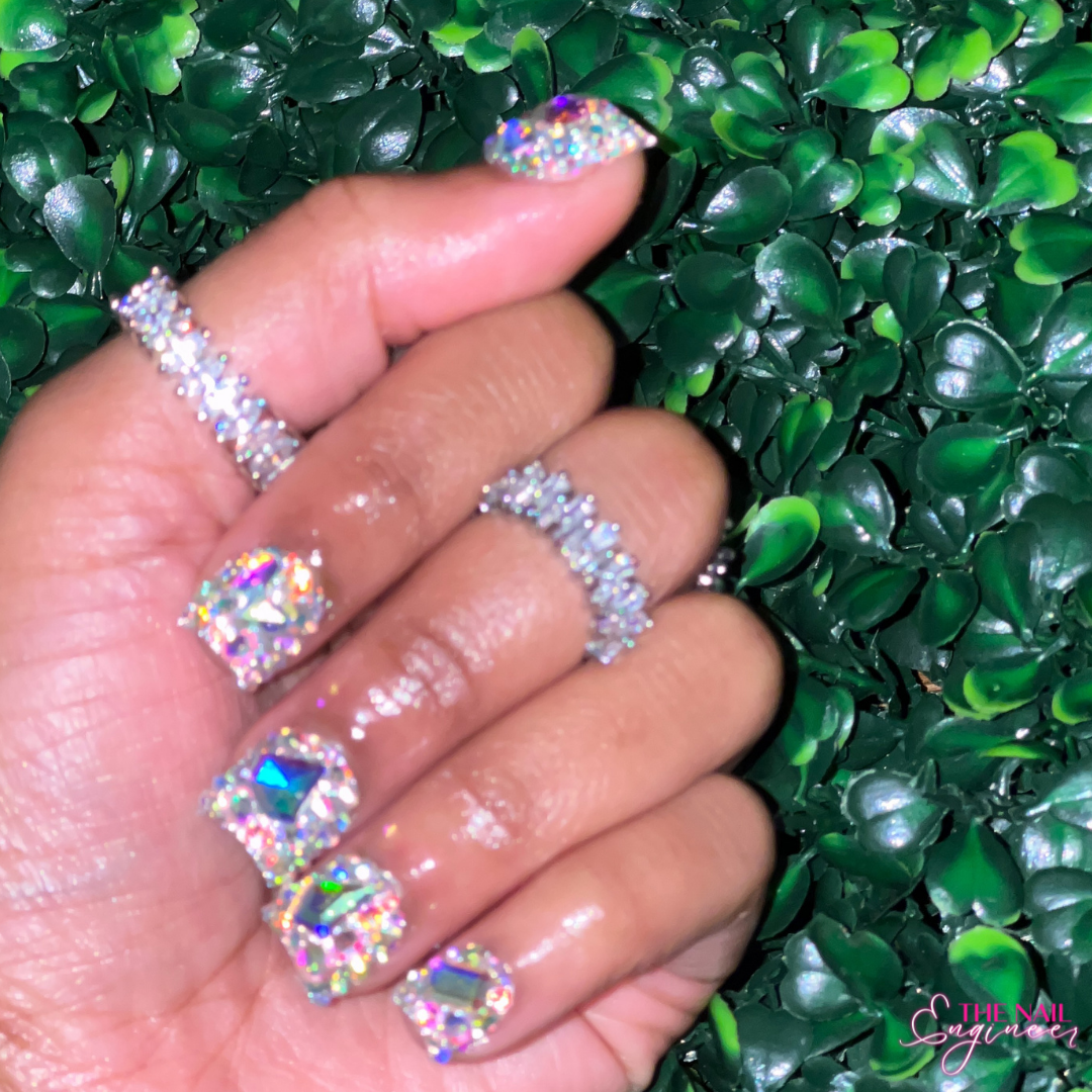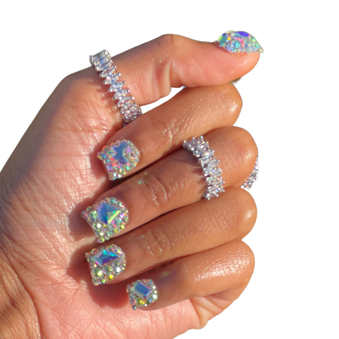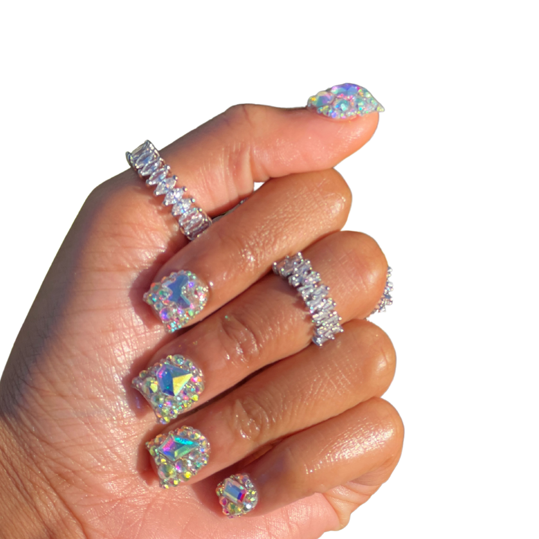 This full bling set is perfect for the material girls. It has a reflective glitter base and full bling designs with various AB crystal shapes.