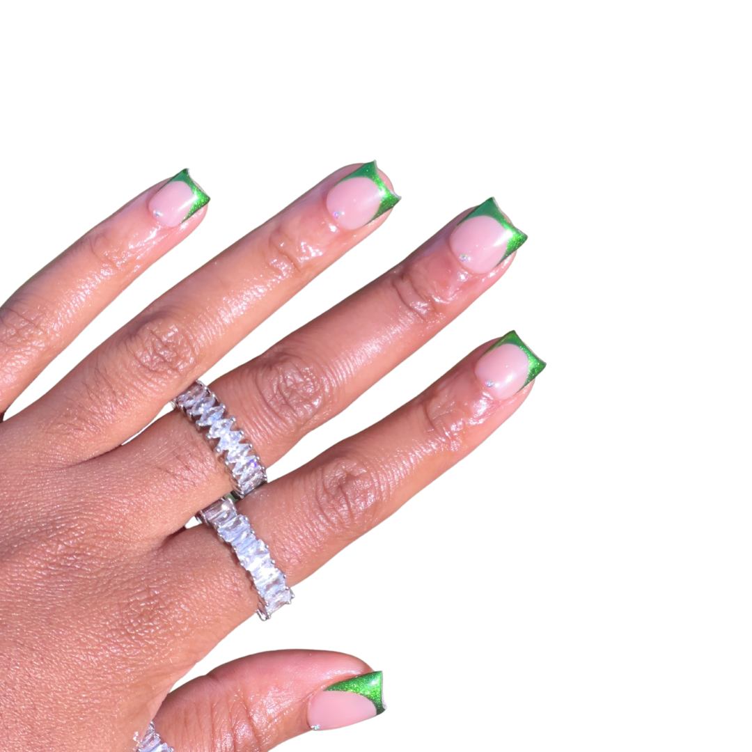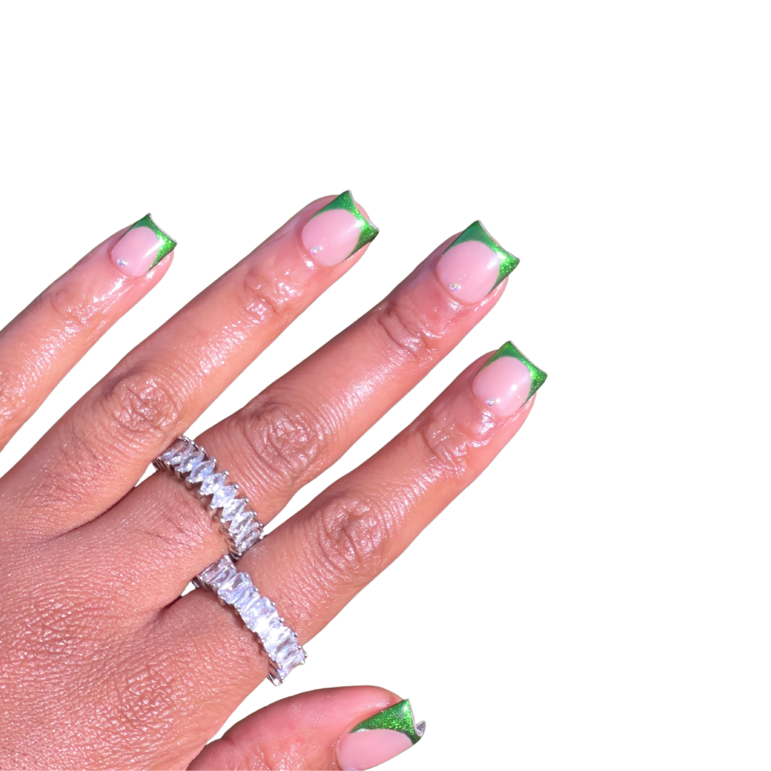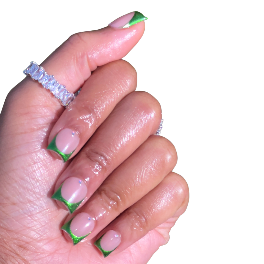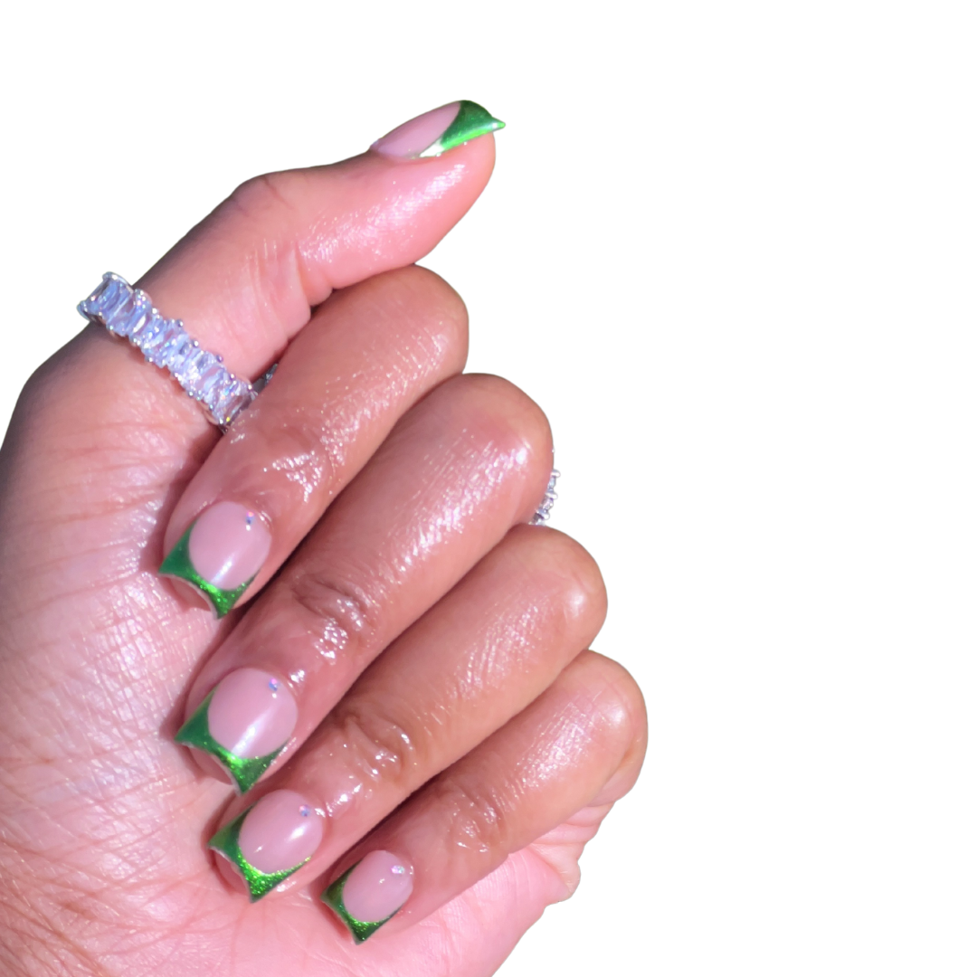 Money making green chrome french tips with a glittery base! This set is so cute and perfect for the holidays.