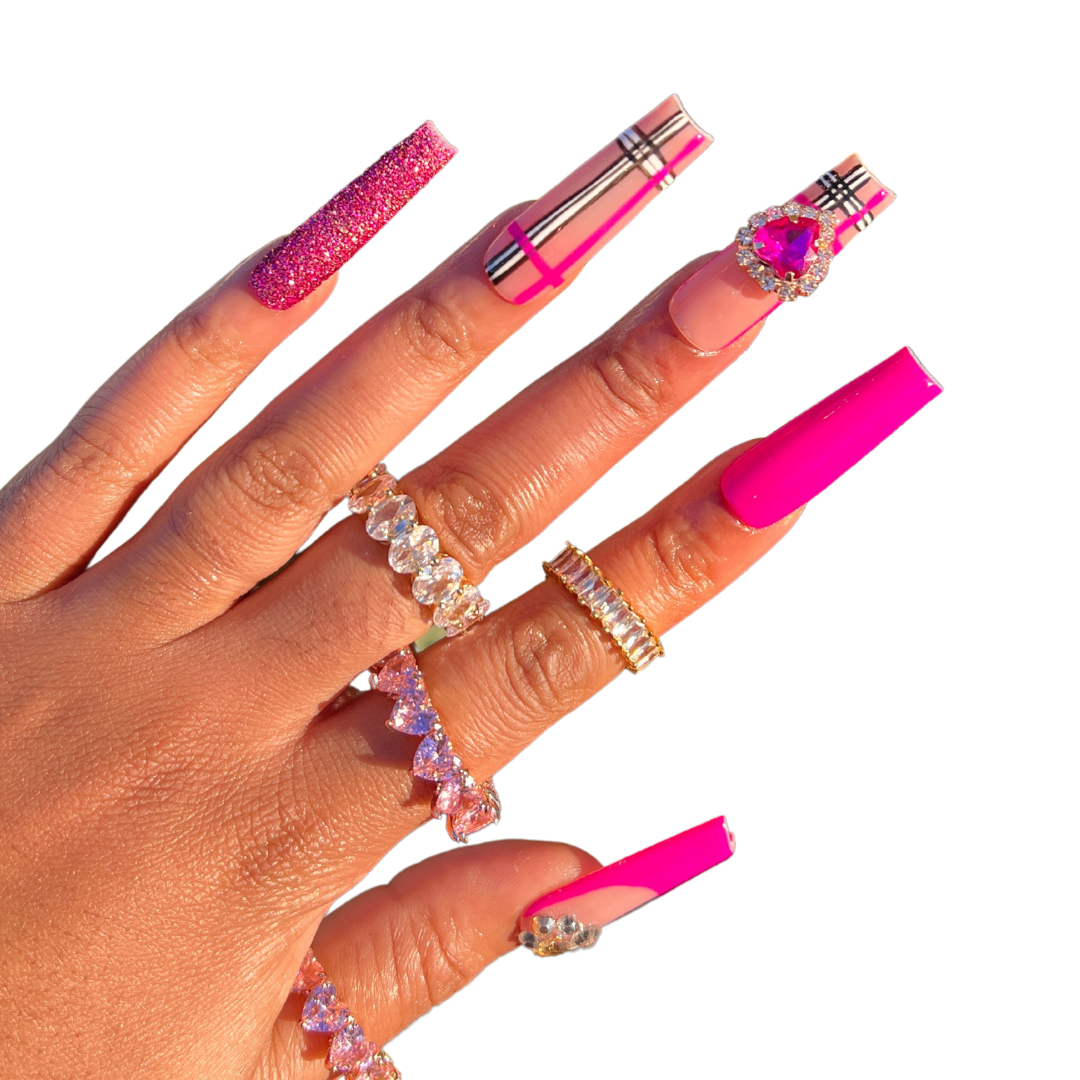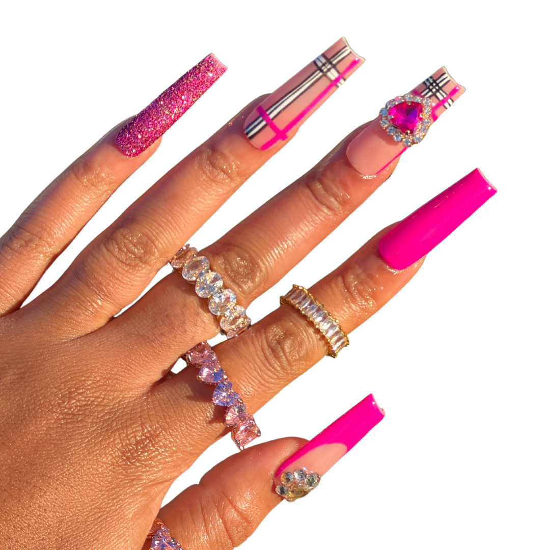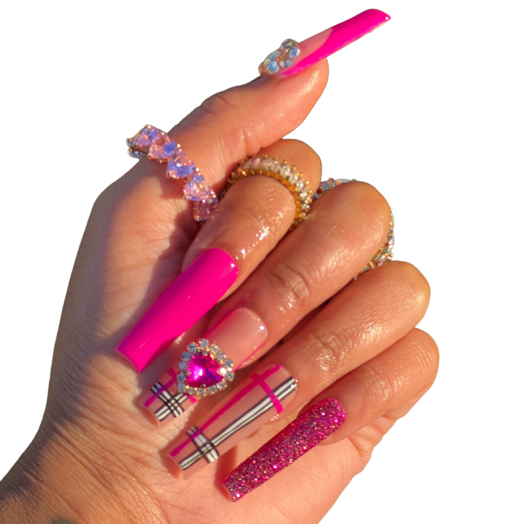 - 2 sugar glitter nails, 2 pink nails, 2 plaid french tip nails with bling, 2 plaid nails, 2 french tip nails with bling