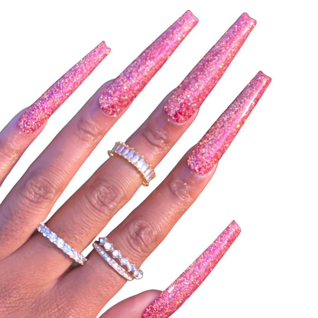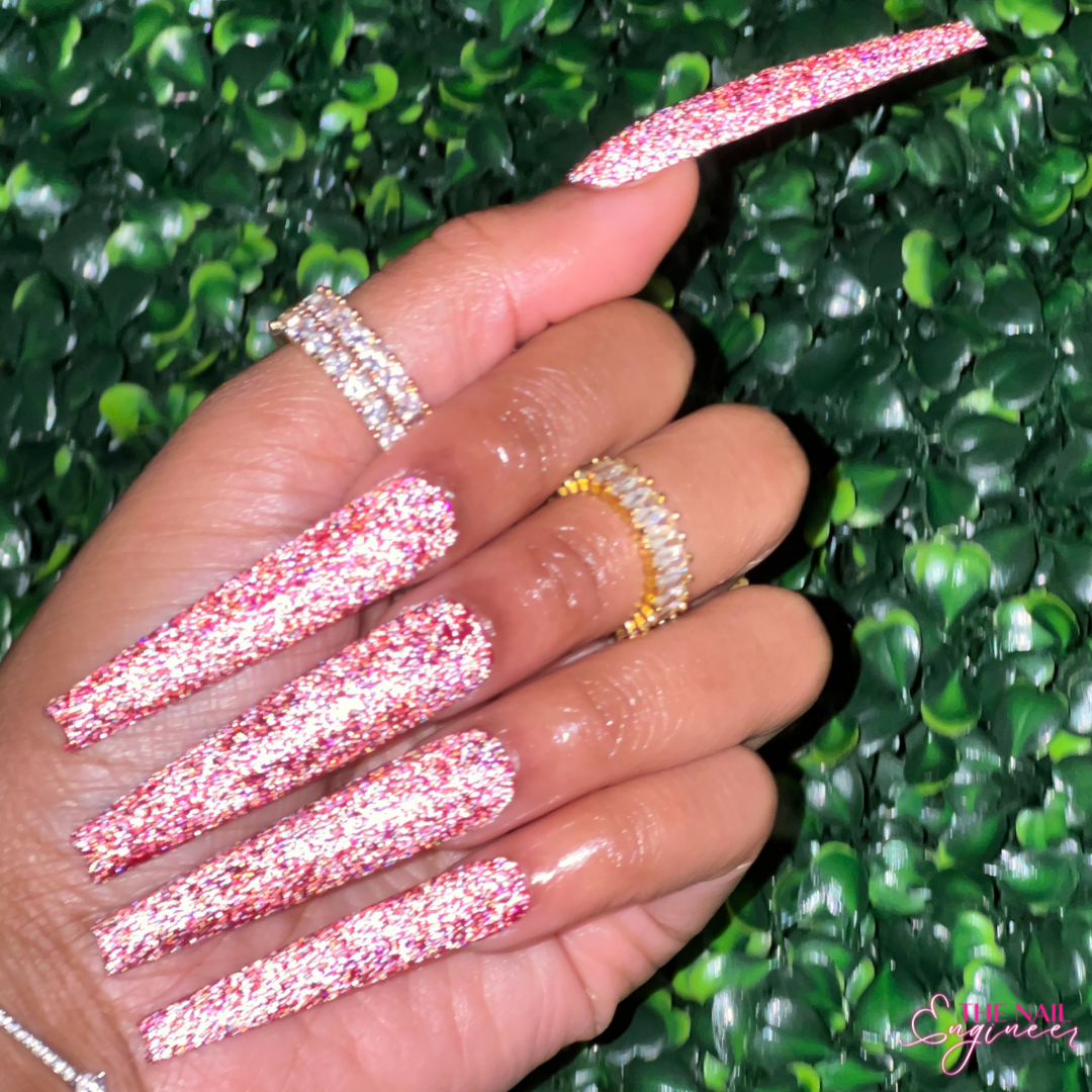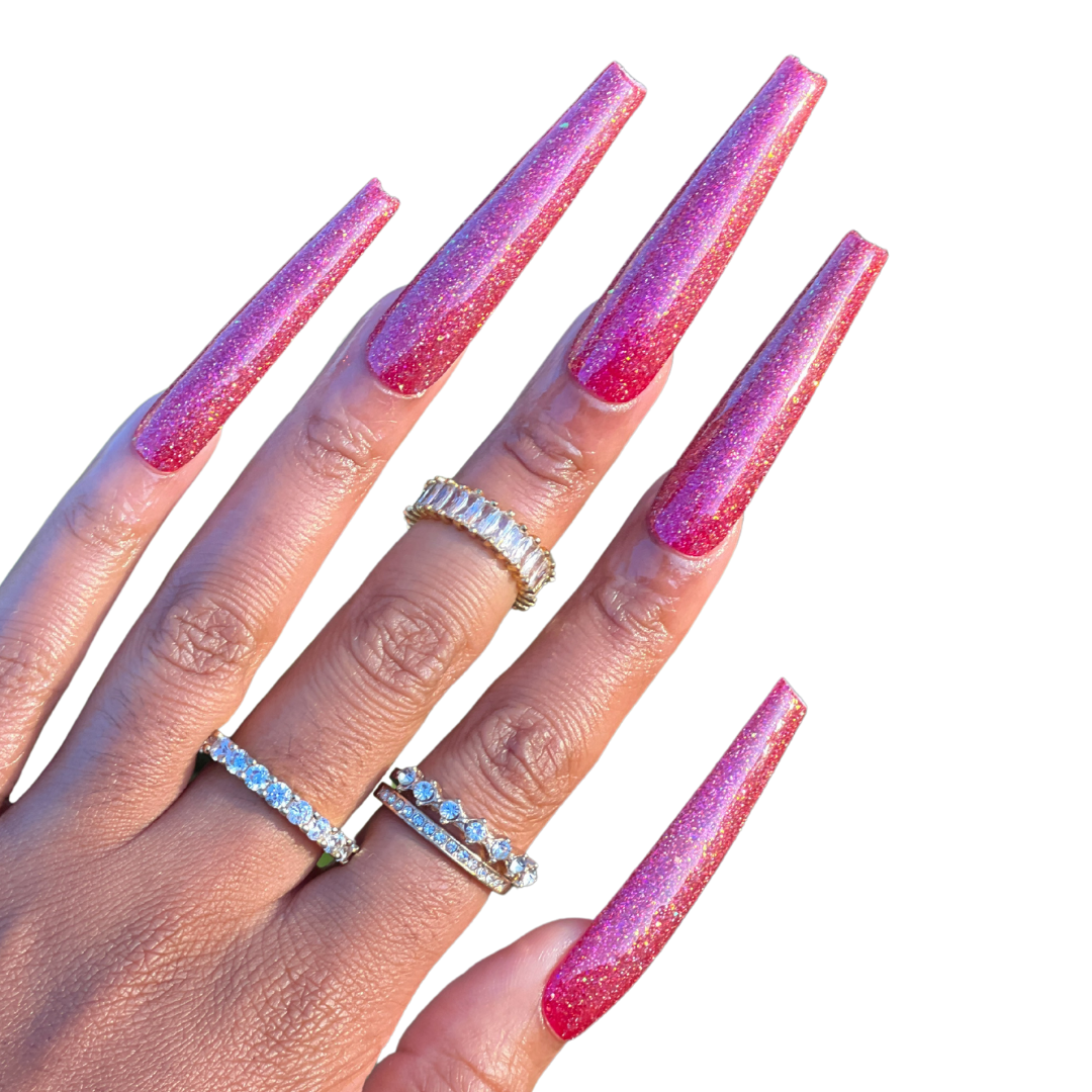 This set features a super unique multi-colored reflective glitter with a plum pink base.