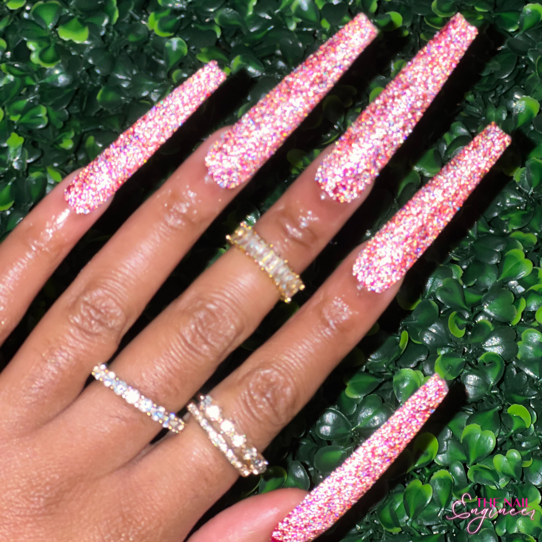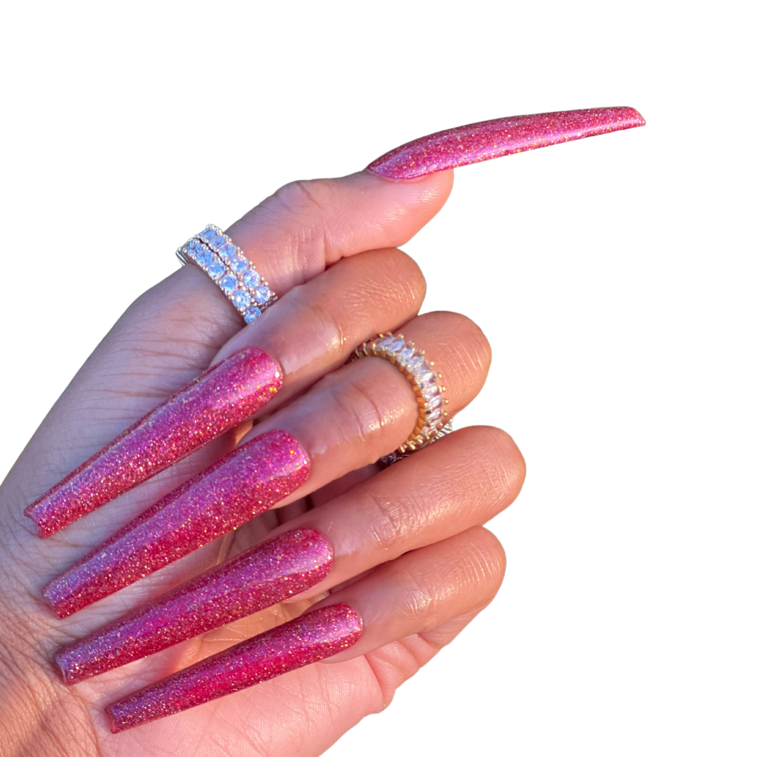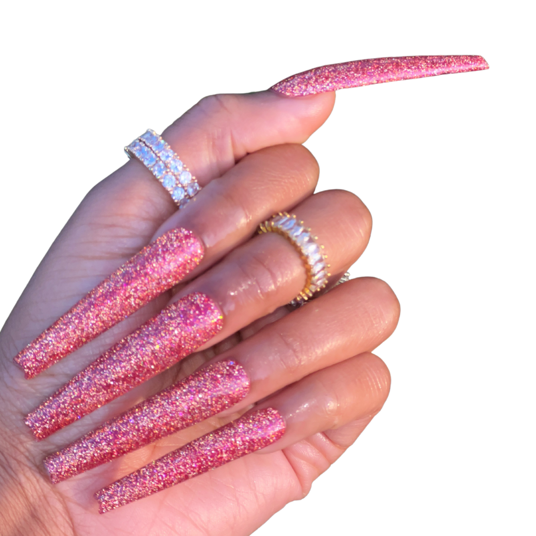 This set features a super unique multi-colored reflective glitter with a plum pink base.