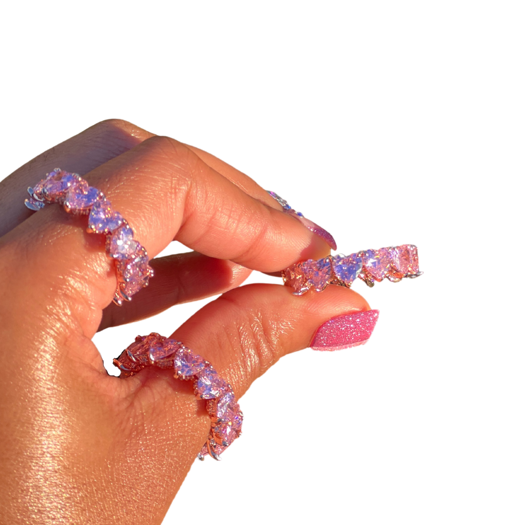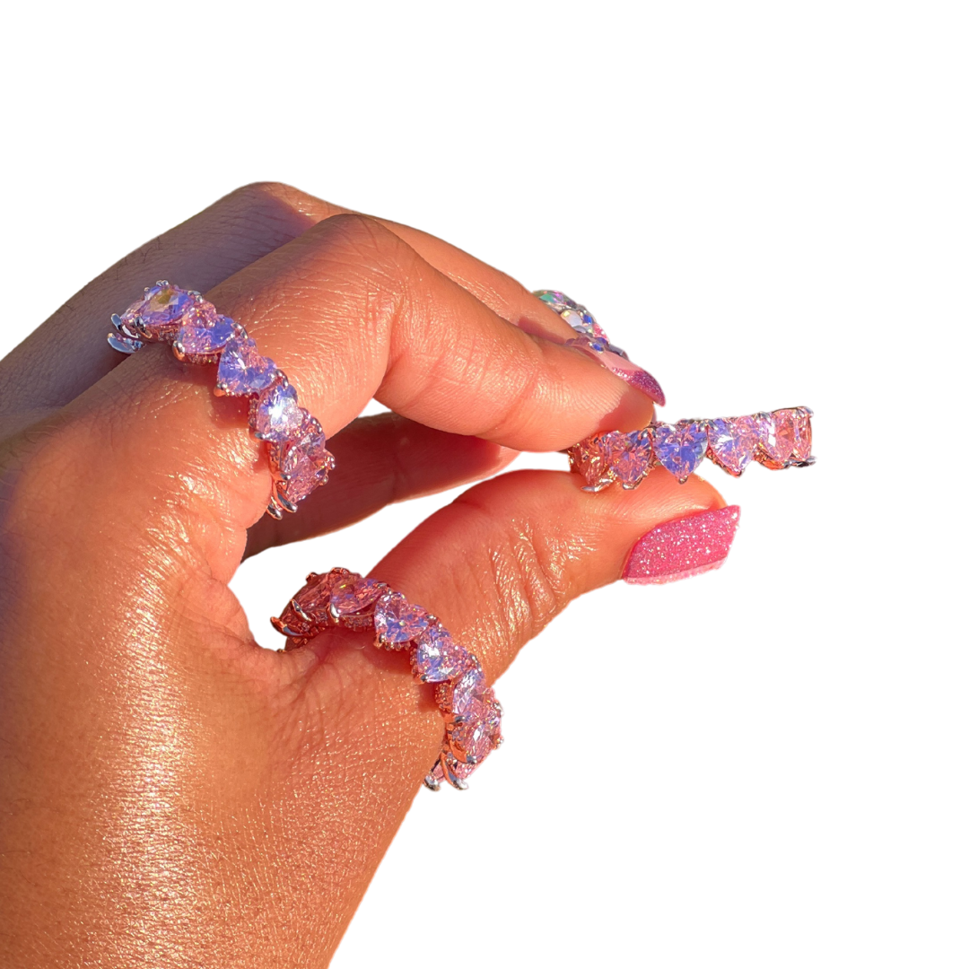 This ring features heart shaped pink cubic zirconia stones and rose gold-plated details.