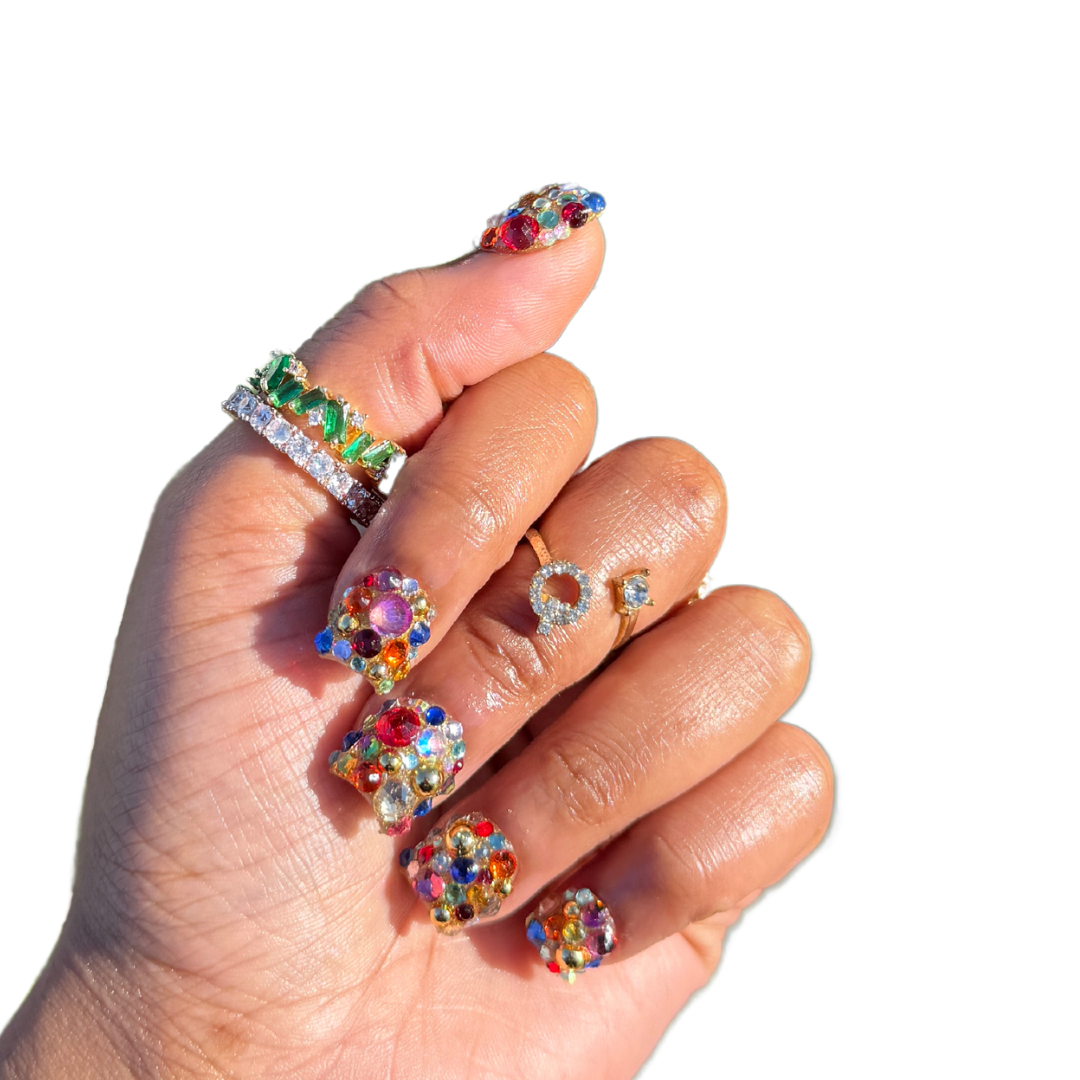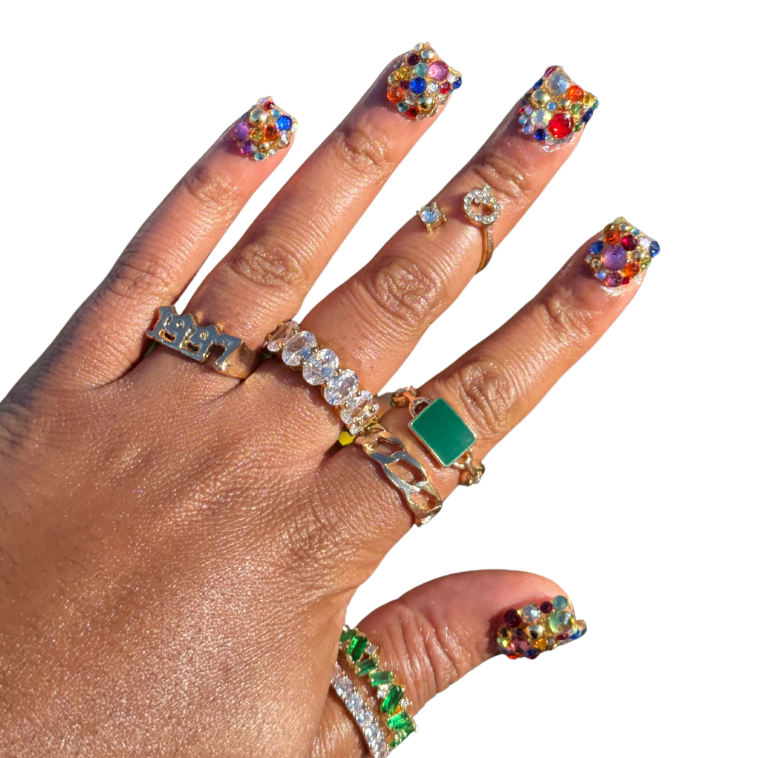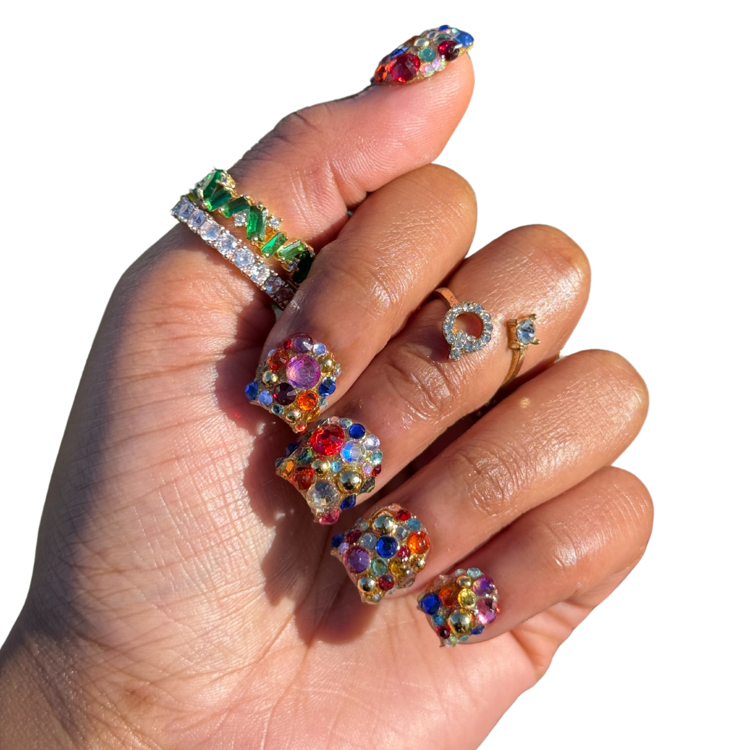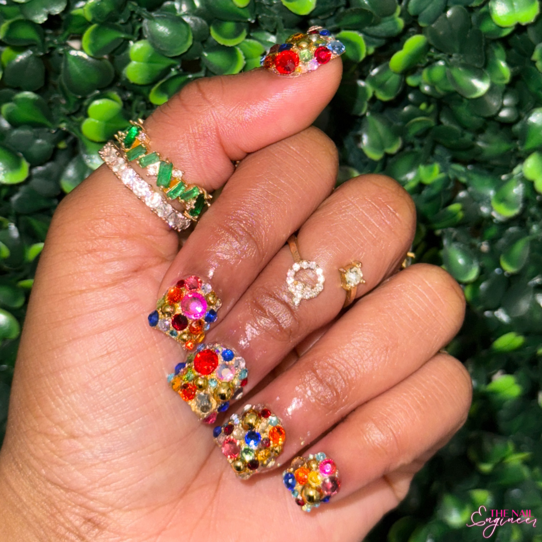 This full bling set is perfect for the material girls. It has a gold reflective glitter base and full bling designs with various colorful jewels.