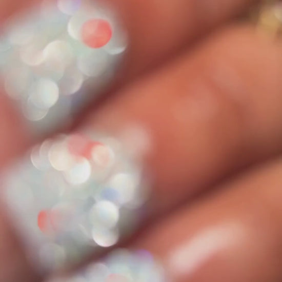 Silver reflective glitter nails with a flash of blue.