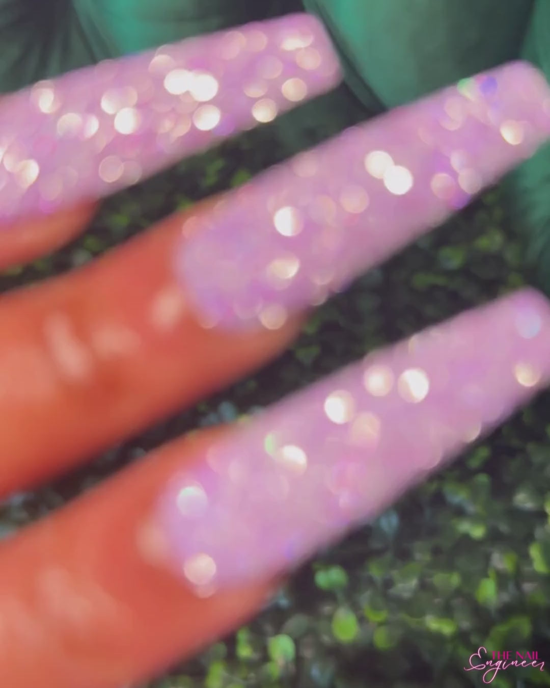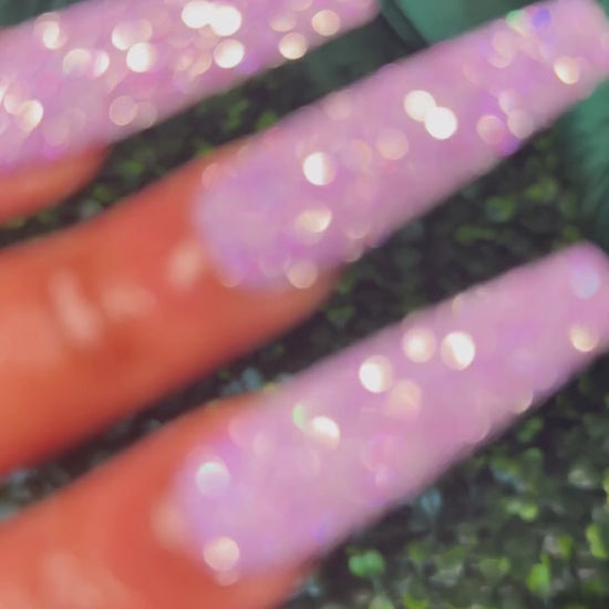 Purple reflective glitter nails.