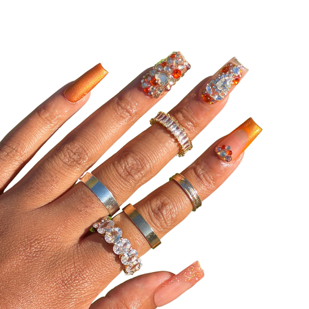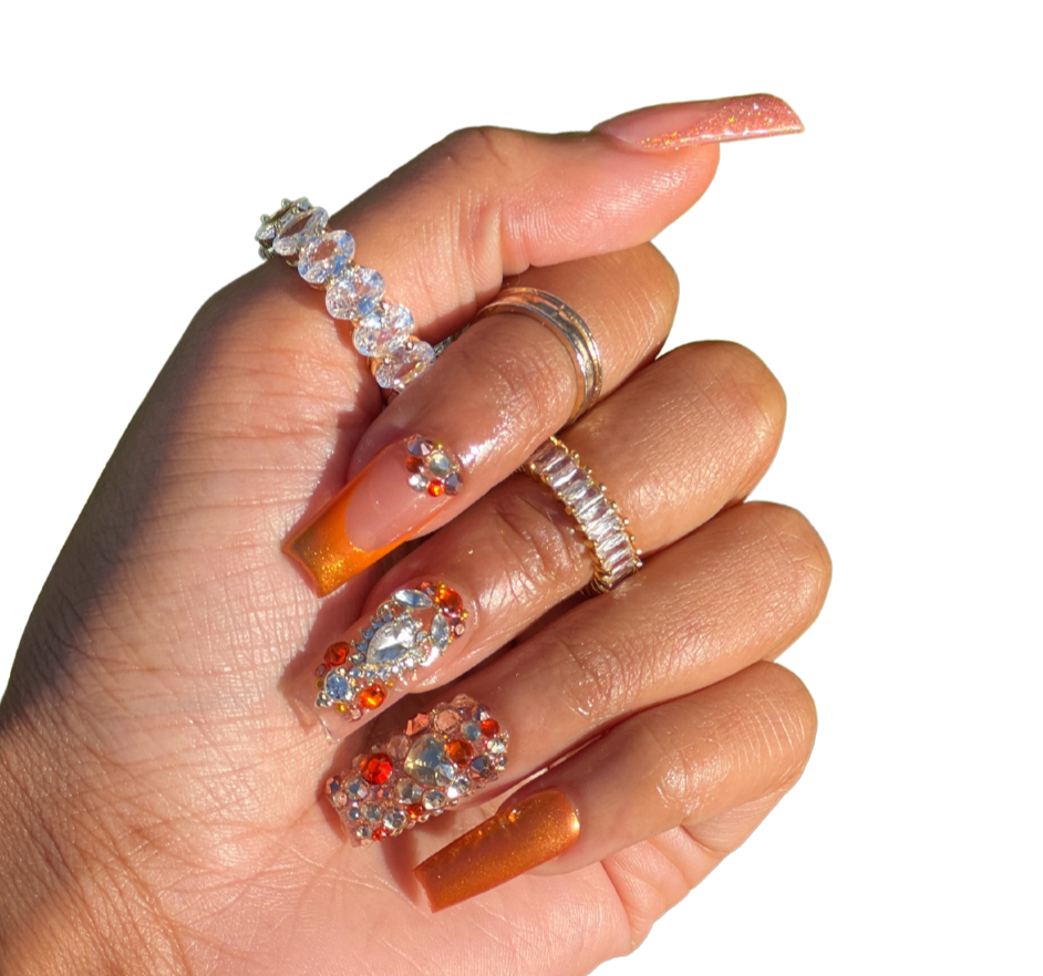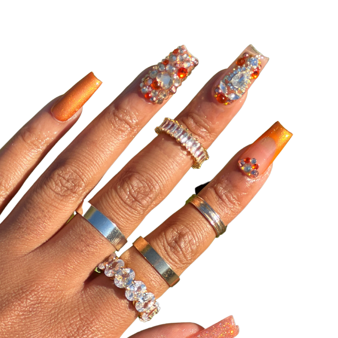 - 2 reflective glitter french tips, 2 chrome ombre french tips, 2 luxe bling design nails, 2 full bling nails, 2 chrome nails