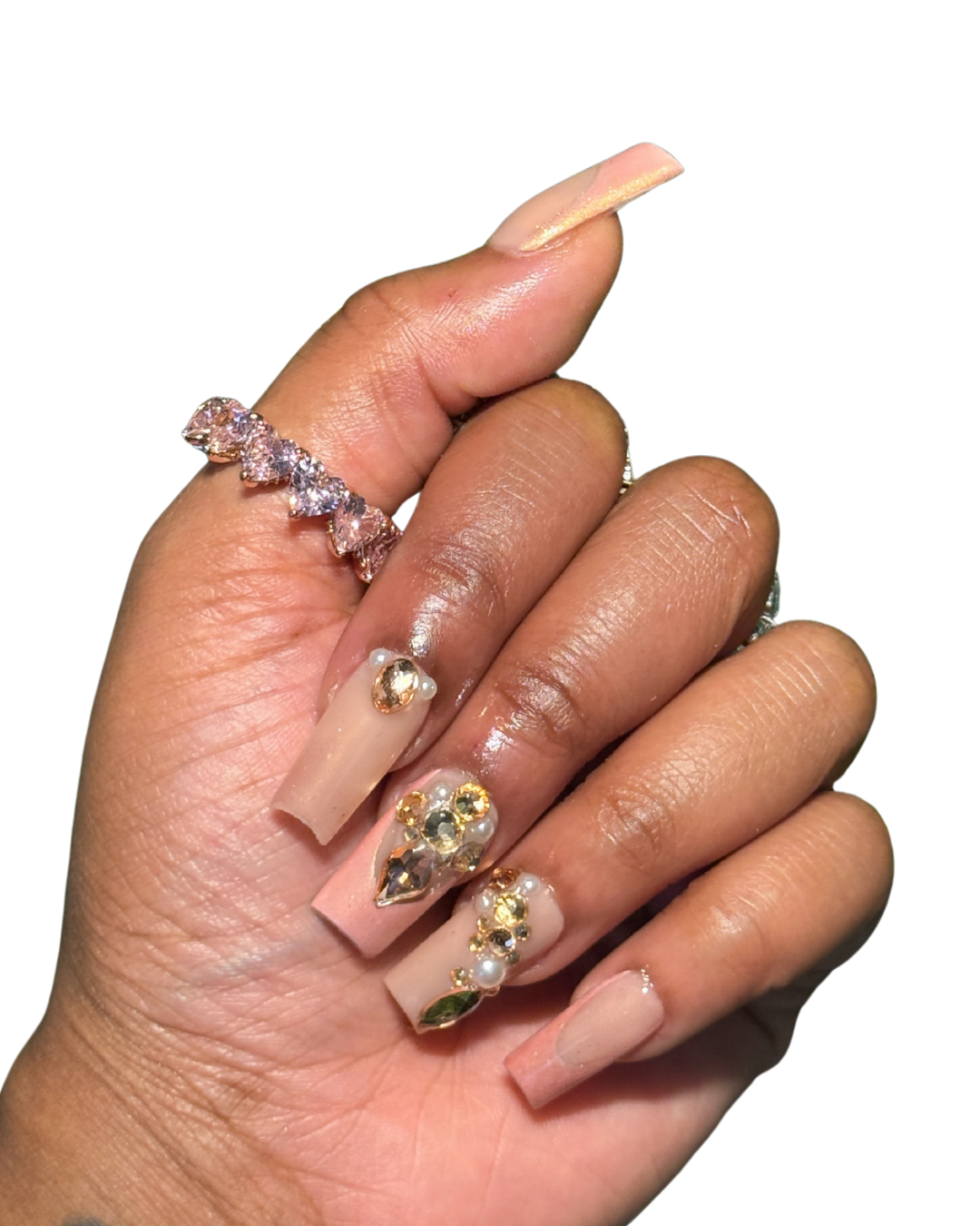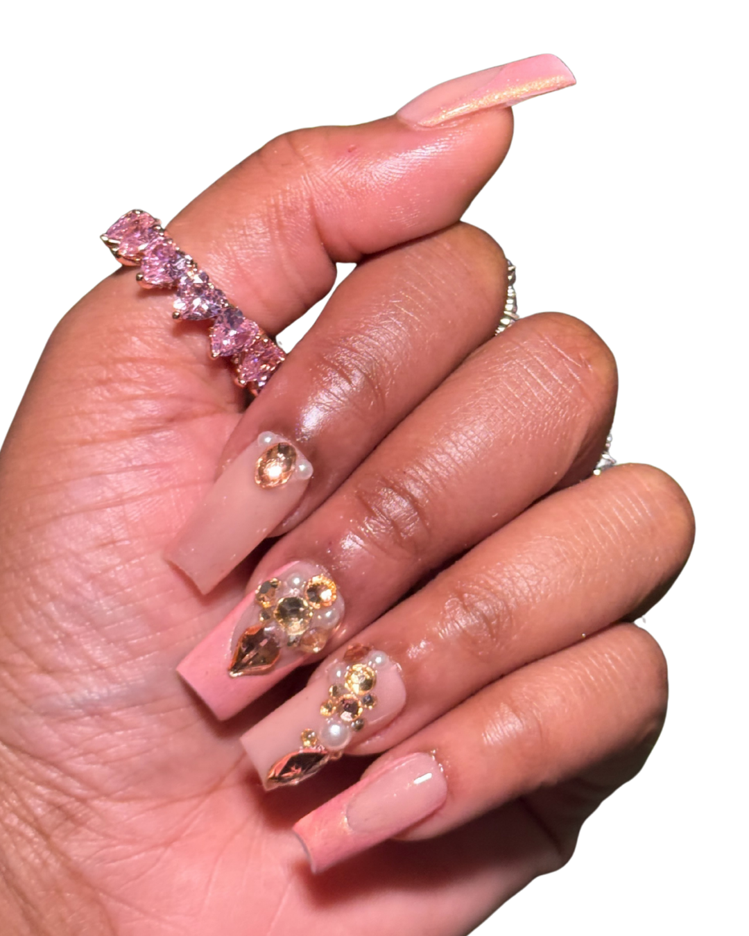 Dainty and unique! This set of nails features a rosé / orange chrome blend with crystal and pearl accents.