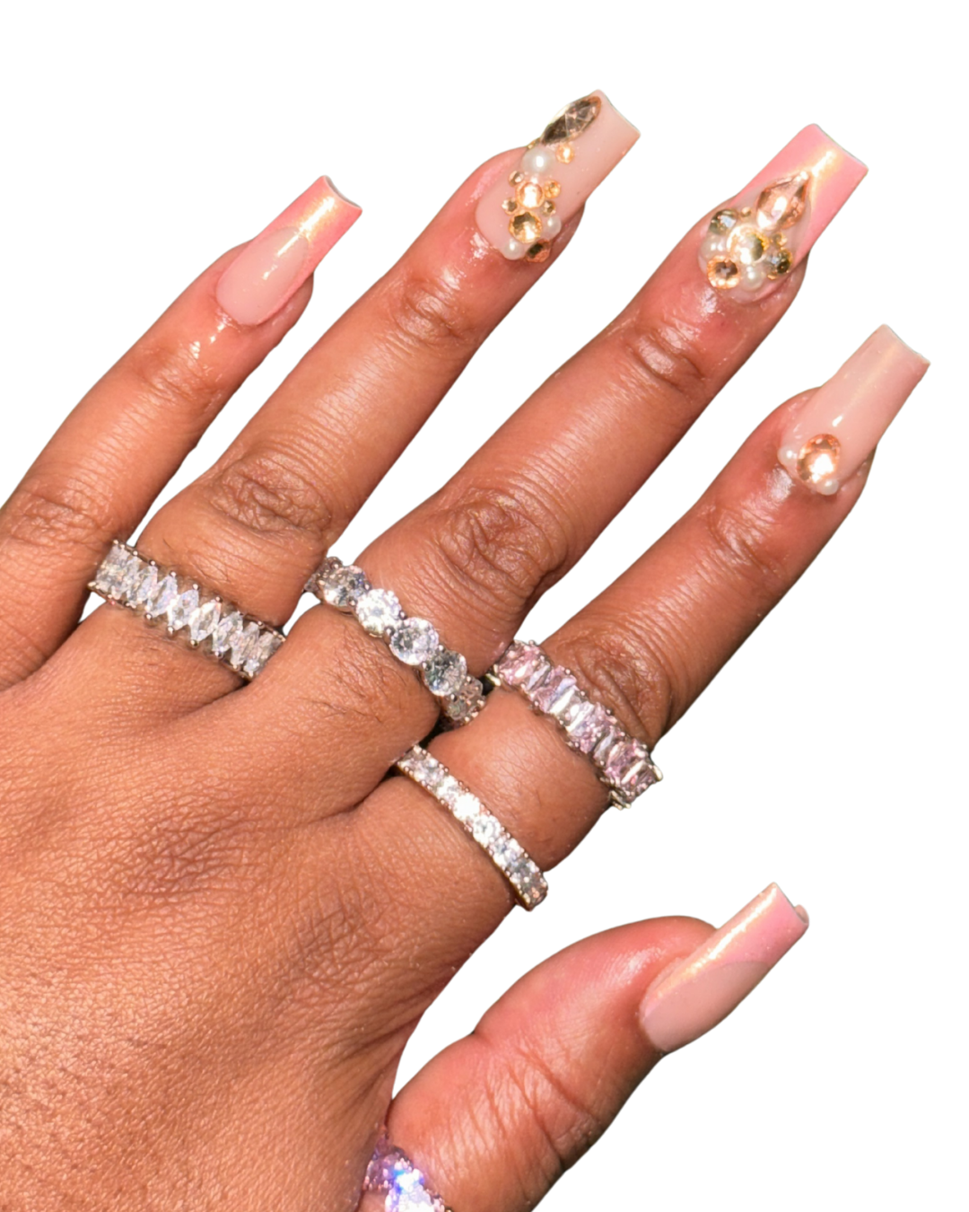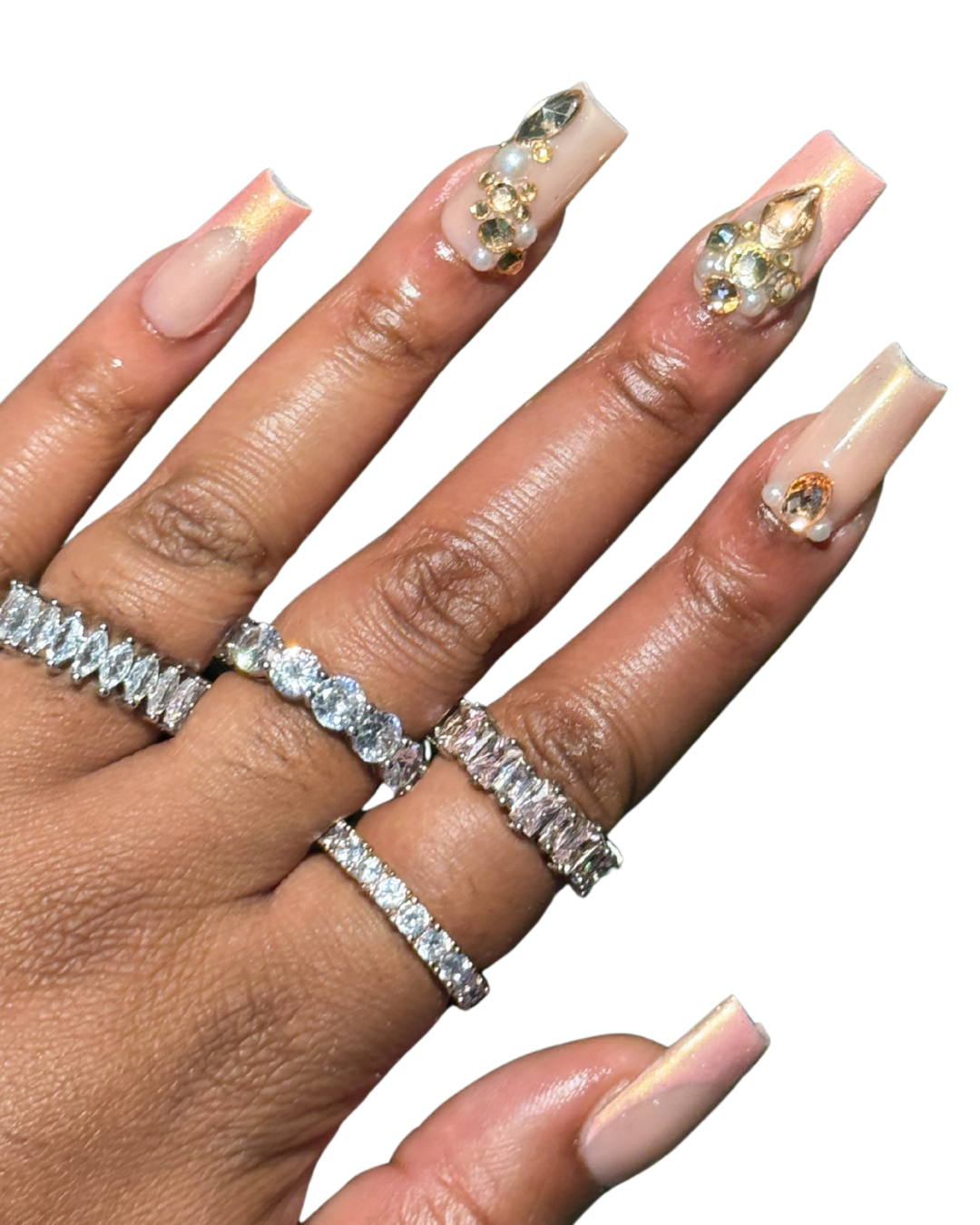 - 4 chrome french tip nails, 2 chrome ombre nails with bling design, 2 french tip nails with bling designs, 2 bling design nails